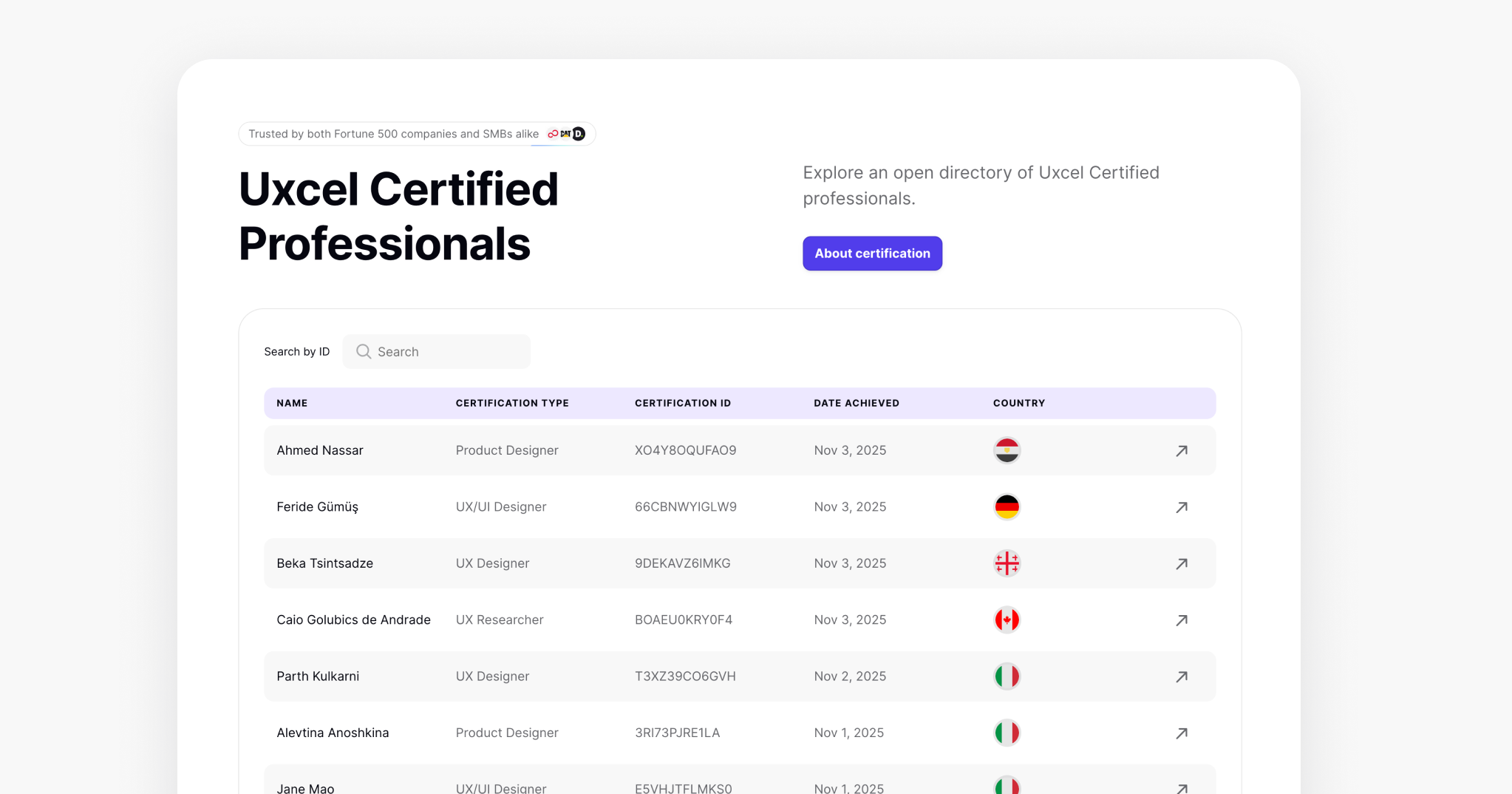 Uxcel’s professional certifications now come with a new layer of visibility and credibility. Anyone who earns a Uxcel certification is now listed in our official directory of certified professionals.