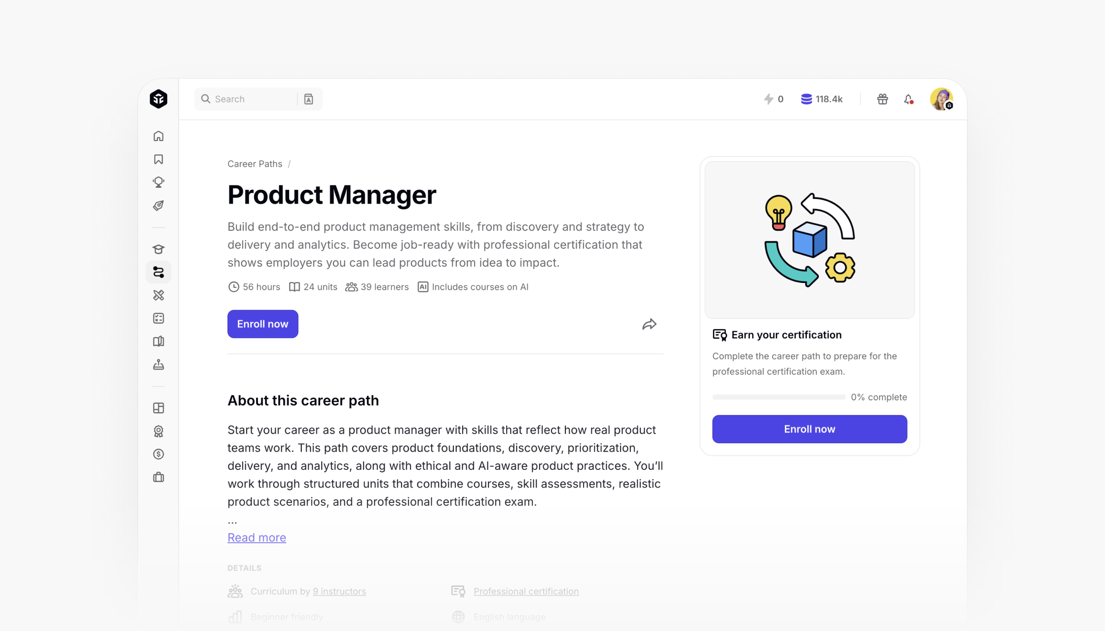 We released a career path that helps you build end-to-end product management skills and earn professional certification. Become job-ready with skills that show employers you can lead products from idea to impact.